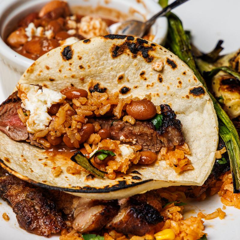 Grilled flour burro y two soft corn tacos, salsas verde y roja, your choice of chicken, barbacoa or carnitas