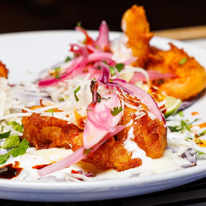 Blue corn masa tortillas with creamy morita mayo, melted cheese, cabbage, and pickled onions • With Tilapia $17.00 | With Shrimp $20.00