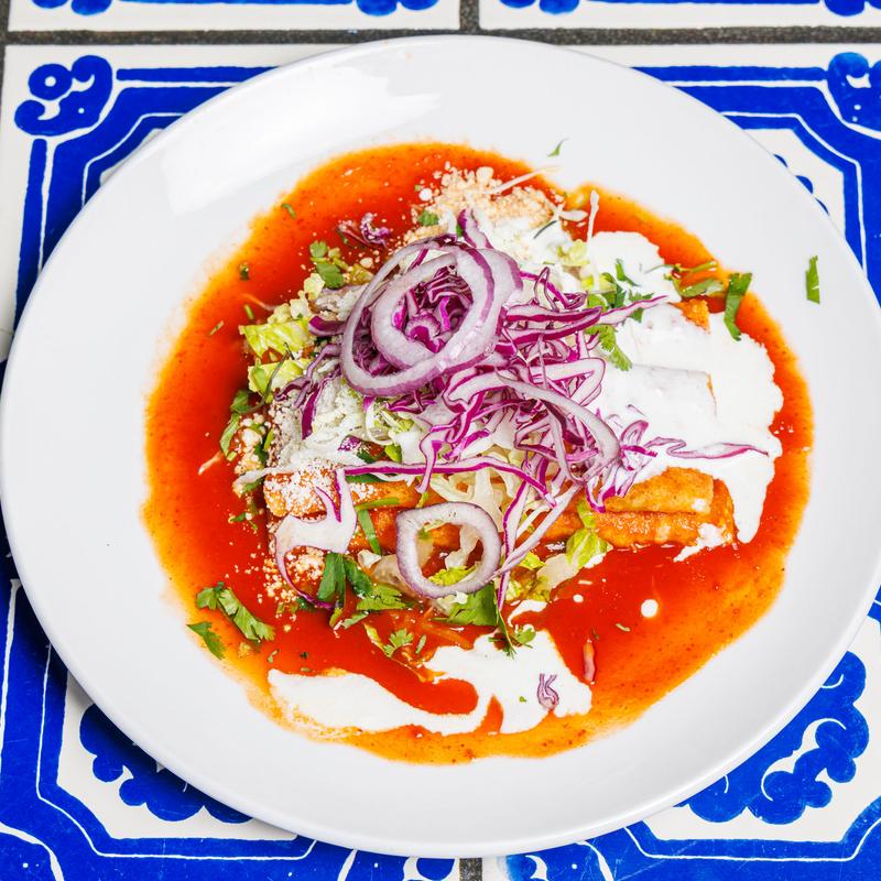 Chicken rolled in thin corn tortillas, onions and cilantro, topped with a red guajillo pepper sauce, romaine, cabbage, crema, and cotija cheese | Barbacoa, Carnitas or Vegetables +$1.00