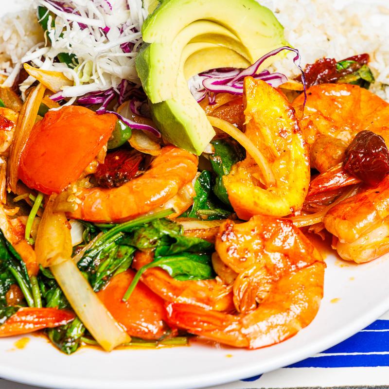 Entrees - All our shrimp are beautiful white large shell on delights served over poblano rice